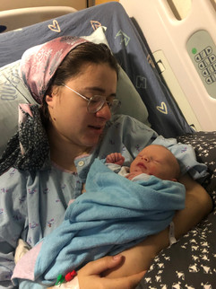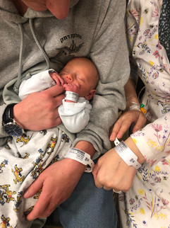 Despite Covid we were all allowed in the hospital, all being Malcolm, myself and Tzvi's parents Bianca and Chaim, although the medical staff were amused that Gila was accompanied by so many people. Gila and Tzvi were given matching bar coded wristbands. Eventually the others were sent off to the waiting room whilst Gila was taken for her epidural then Tzvi went into surgery with her. Baby boy Kanterovitz was born shortly after at 2.7kg, small but perfect. Tzvi went with the baby to the nursery and I went to keep Gila company in recovery.